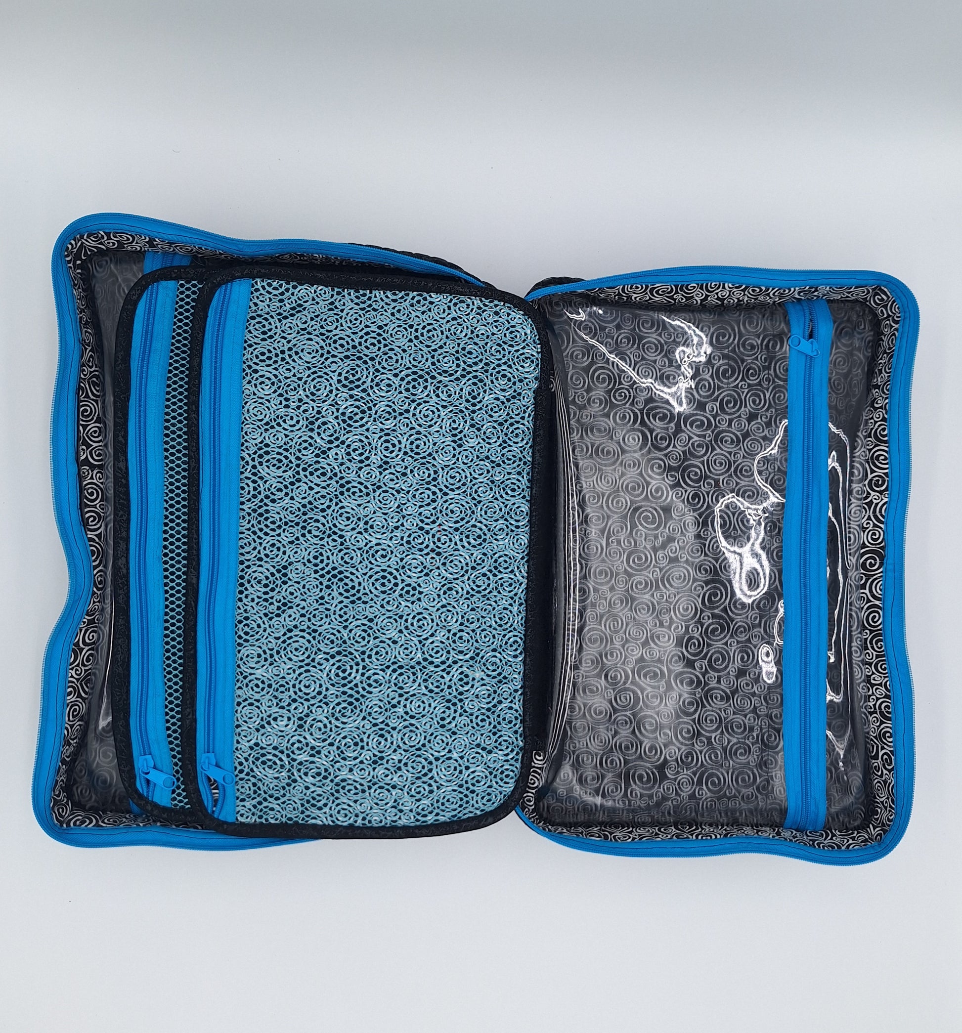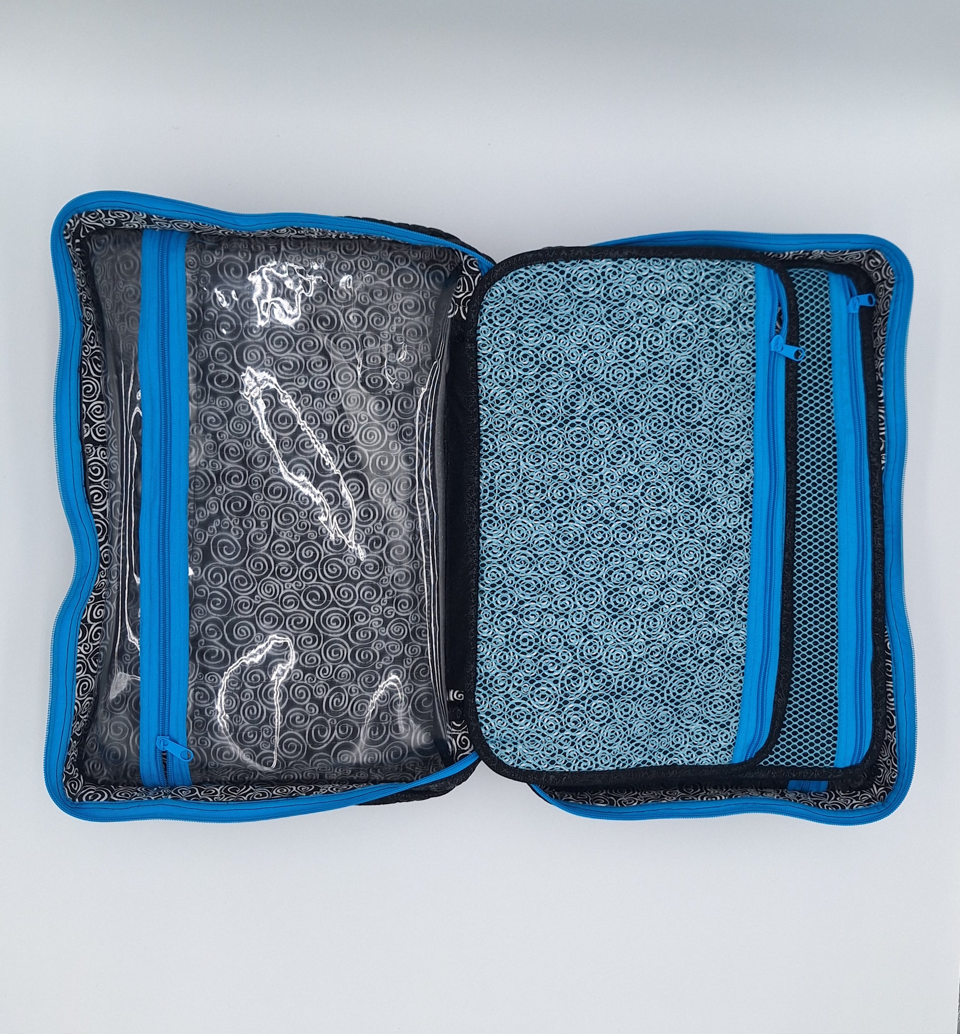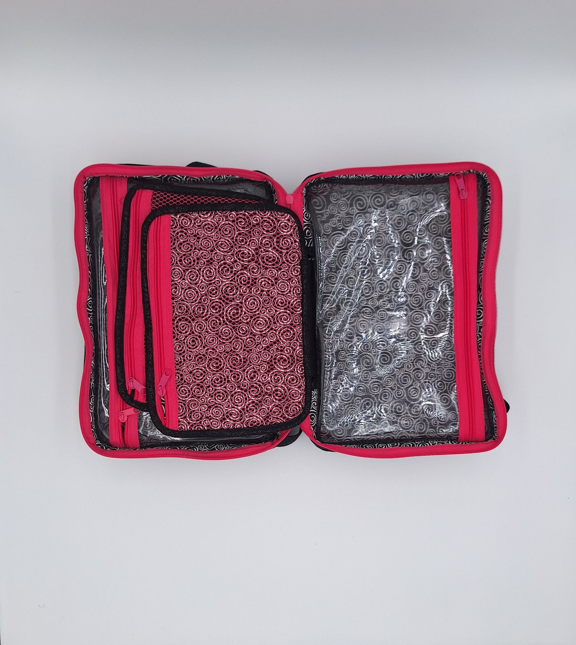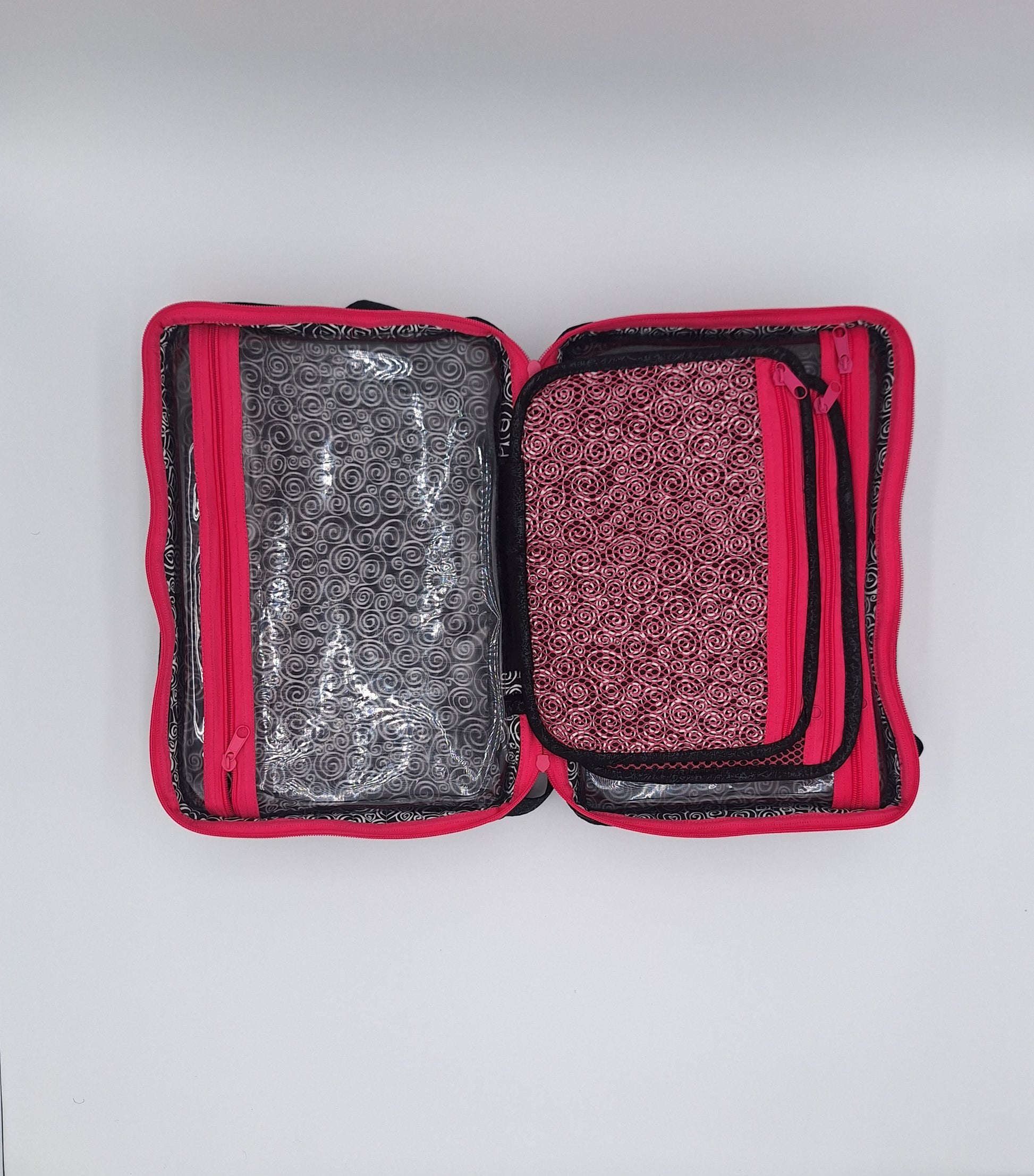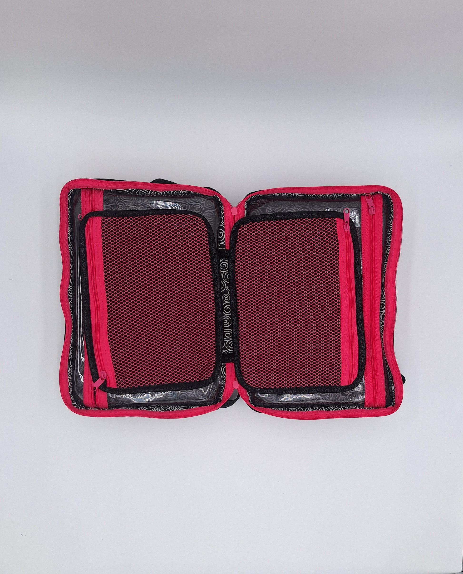 Bags open like suitcases to reveal handy see-through zippered compartments on each side. Attached pocket pages on the inside store and organize a multitude of smaller items.