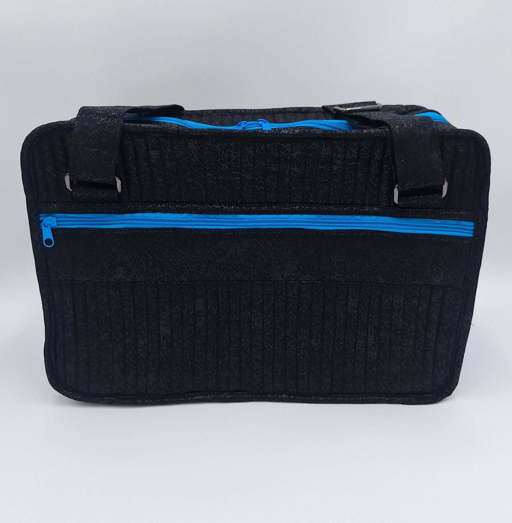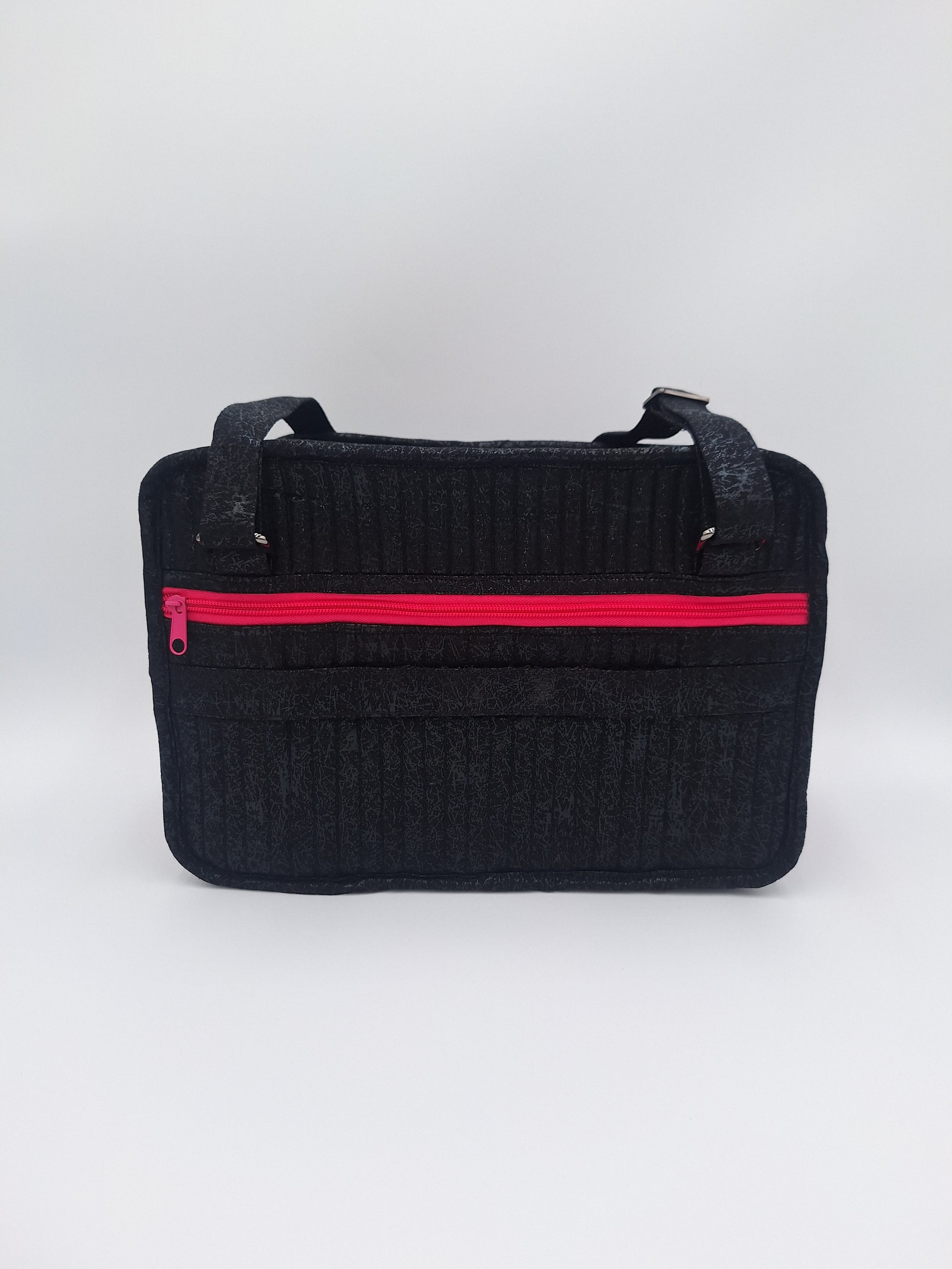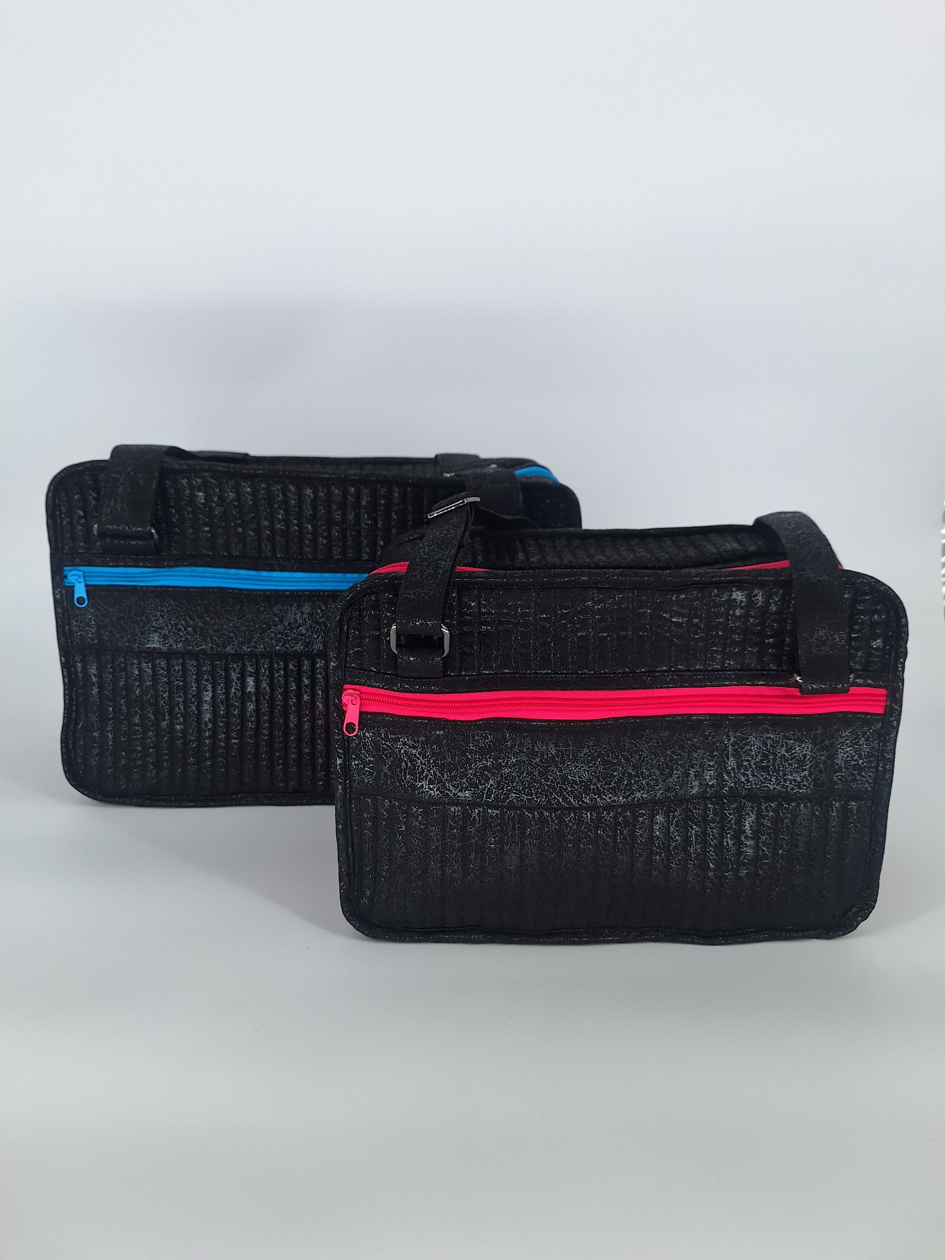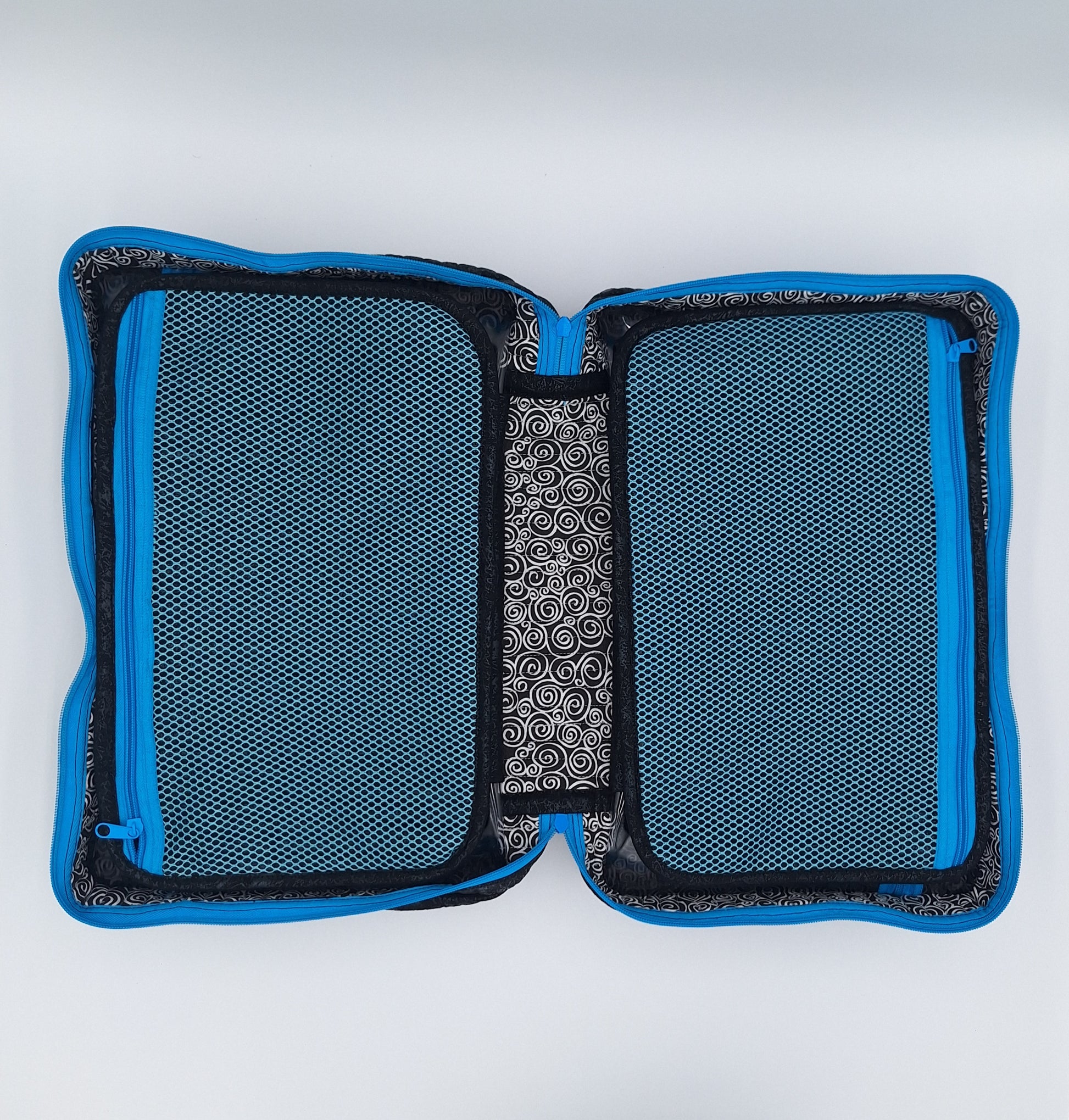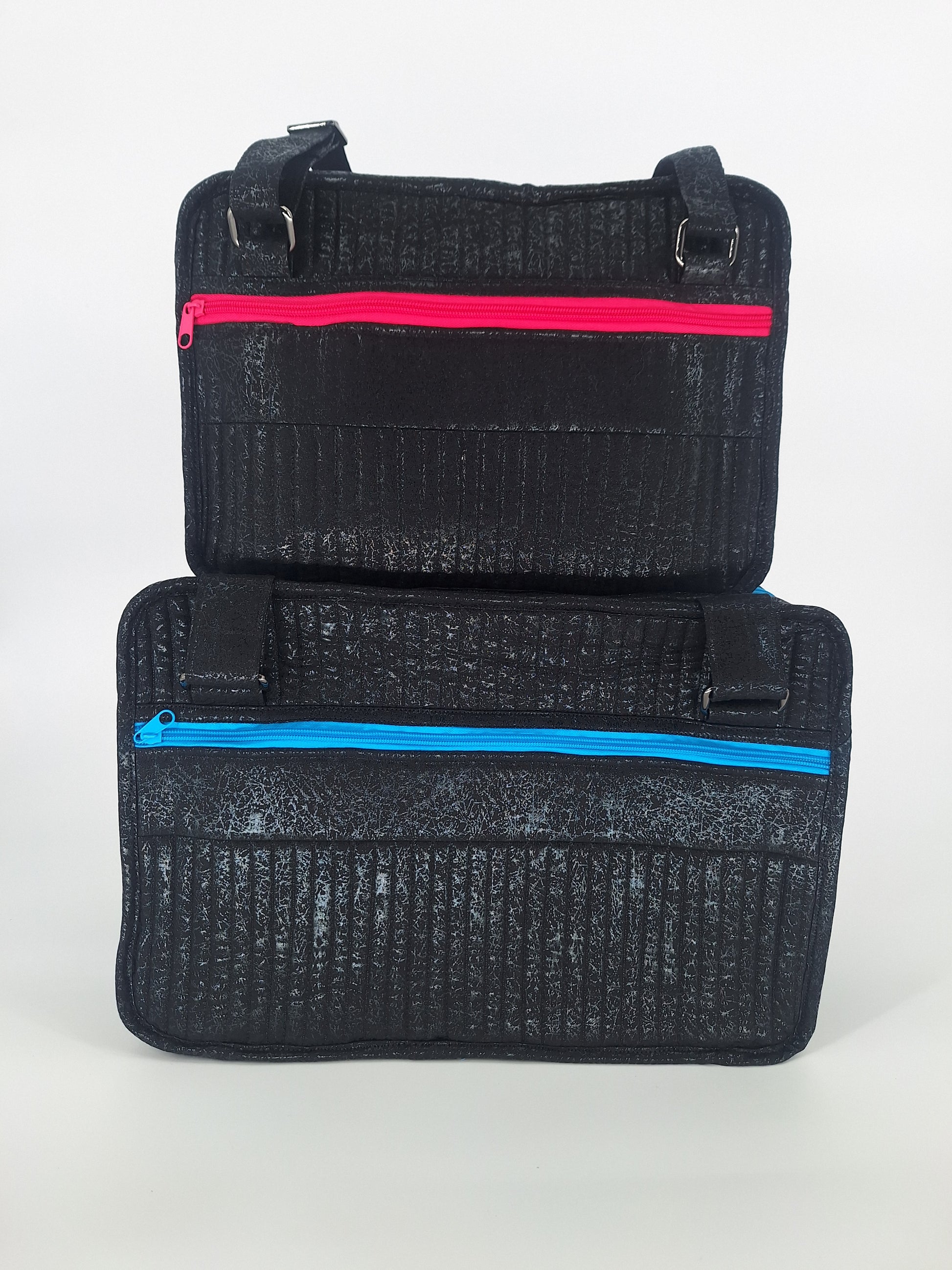 Bags open like suitcases to reveal handy see-through zippered compartments on each side. Attached pocket pages on the inside store and organize a multitude of smaller items.