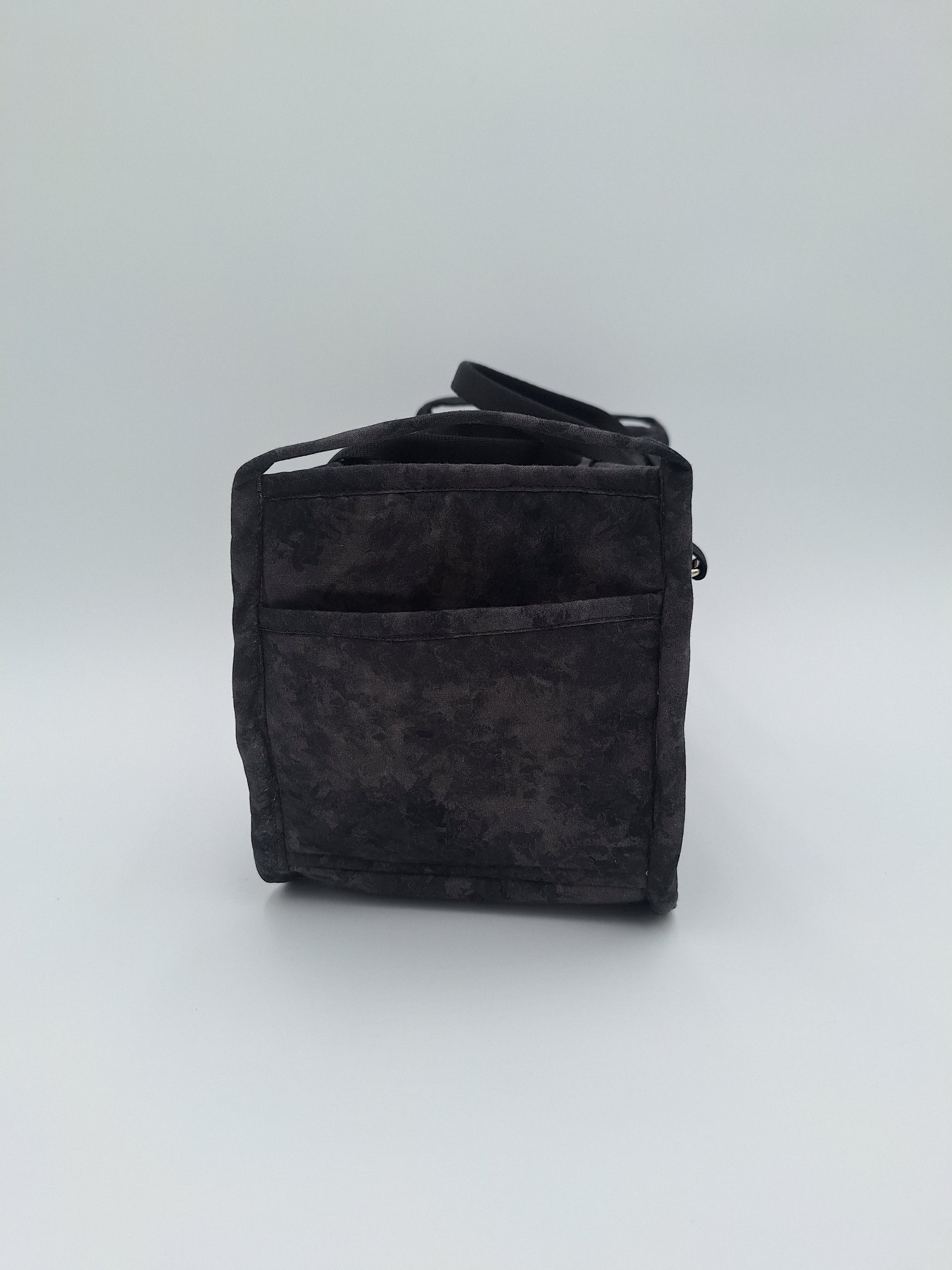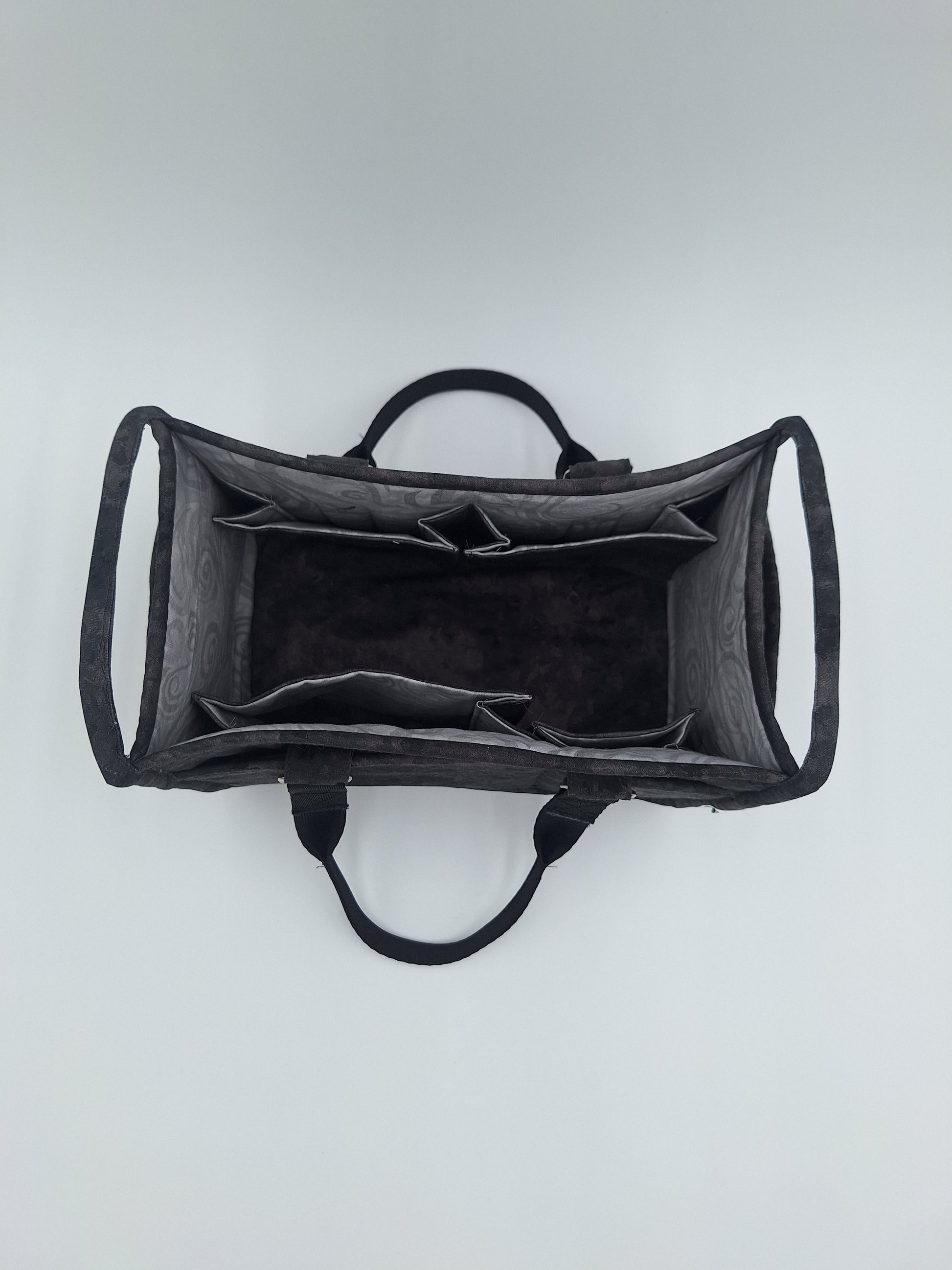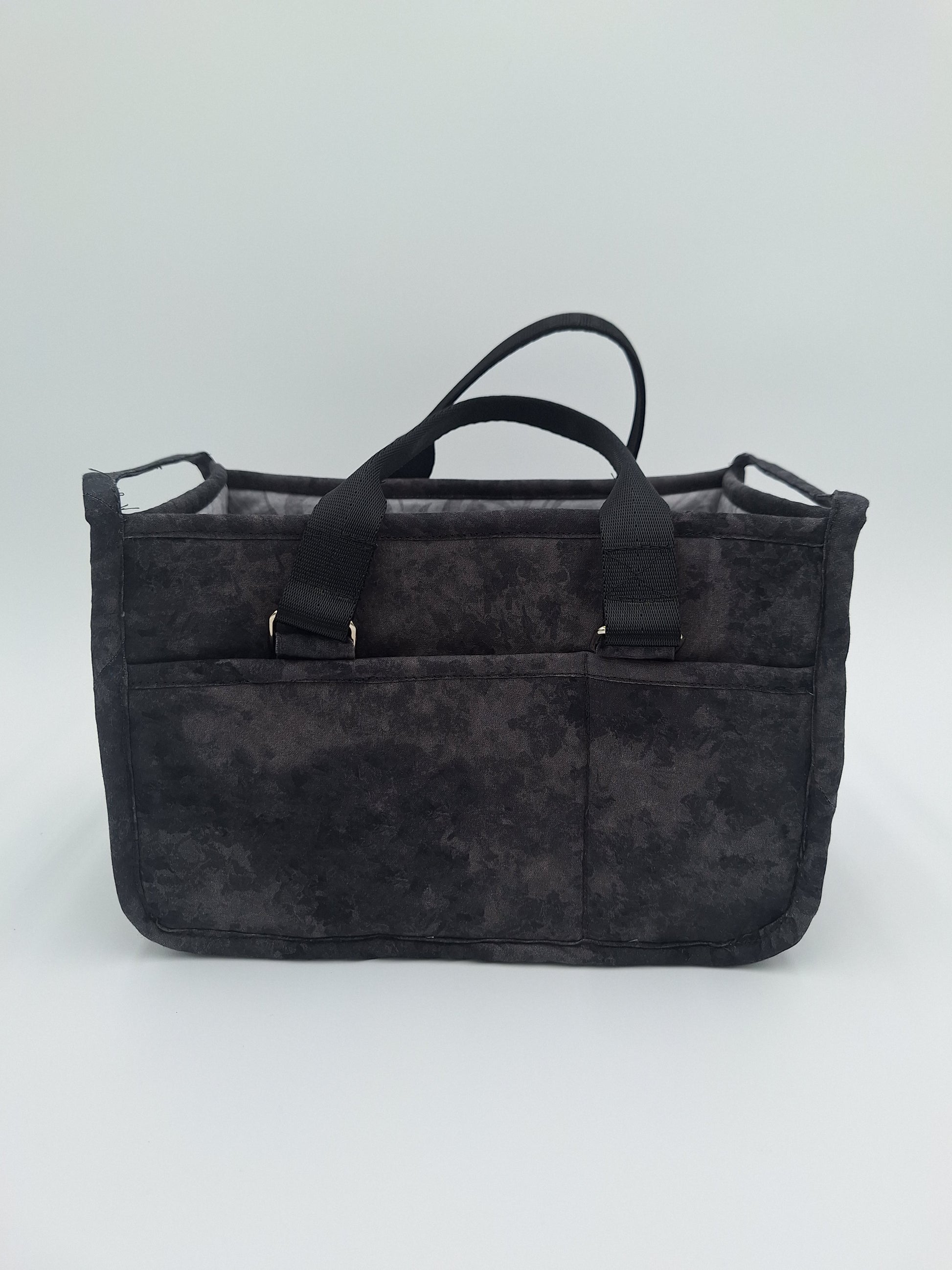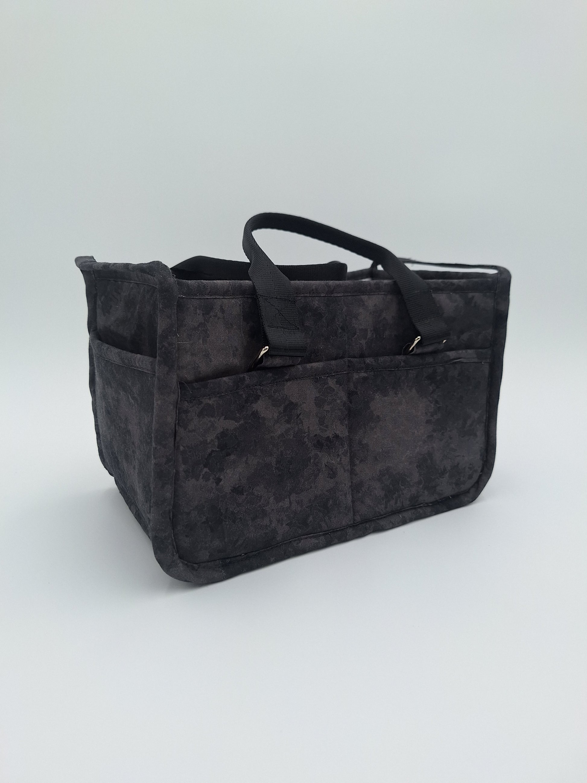 Control the clutter with this sturdy caddy. Its small footprint makes it perfect for using next to the sewing machine or on a desk or coffee table. Five outer slip pockets provide easy access to tools and supplies, and a zippered pocket on one end keeps personal items safe and secure. Expanding dividers on the inside organize a multitude of supplies or collapse flat against the interior of the caddy affording a wide-open interior. Comfy handles make carrying easy and attach with rectangle rings allowing them to fall flat along the front or back.