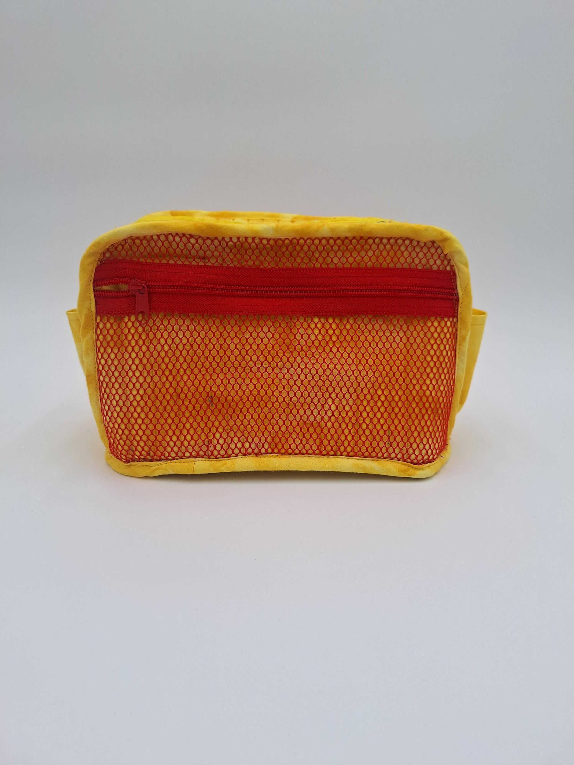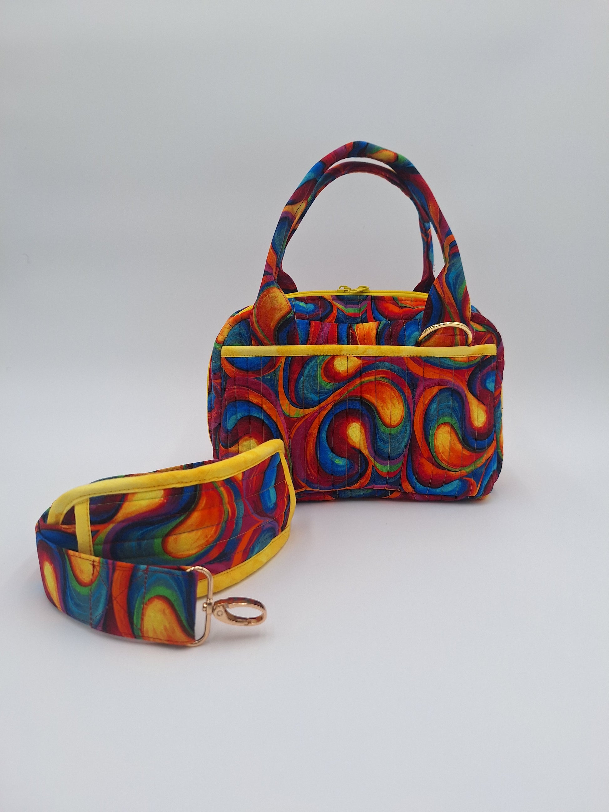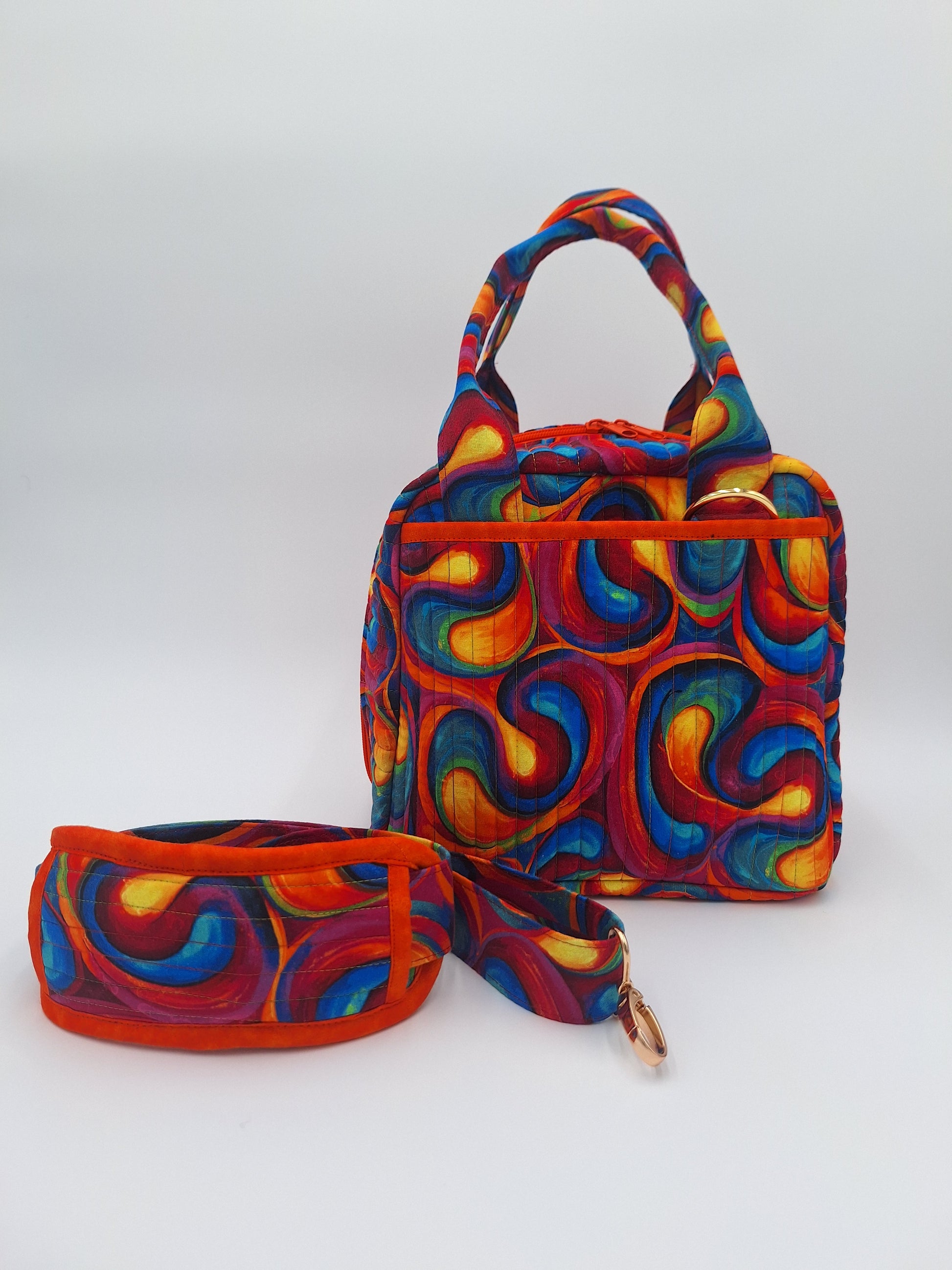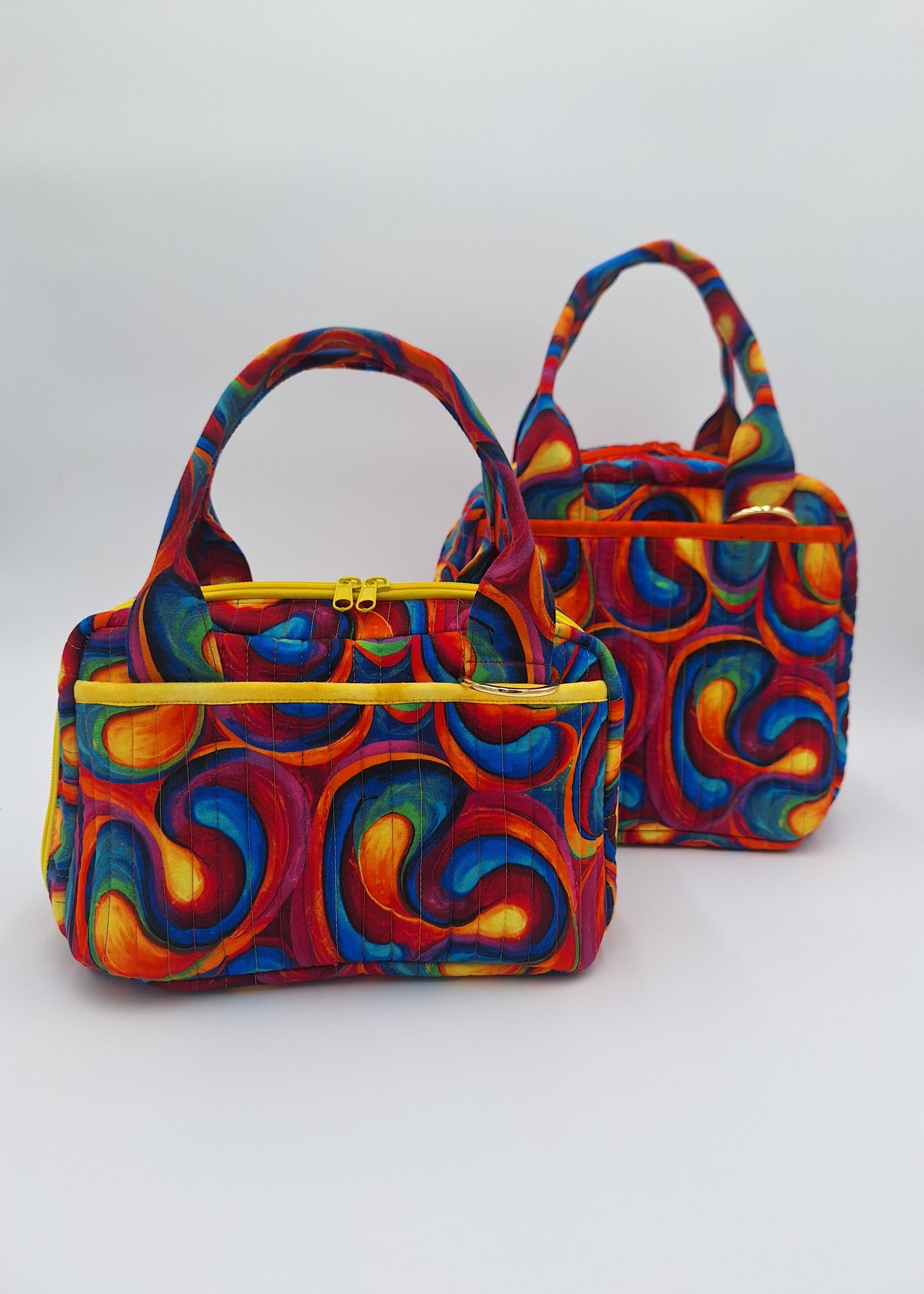 "Carry lunch (or daily needs) in style in these compact yet roomy bag!  Each features a zip-around, gusseted closure and sturdy base.  Outer slip pockets and interior mesh pockets hold an ice pack, napkins, utensils, and more." A carry strap with pad can be added upon request.