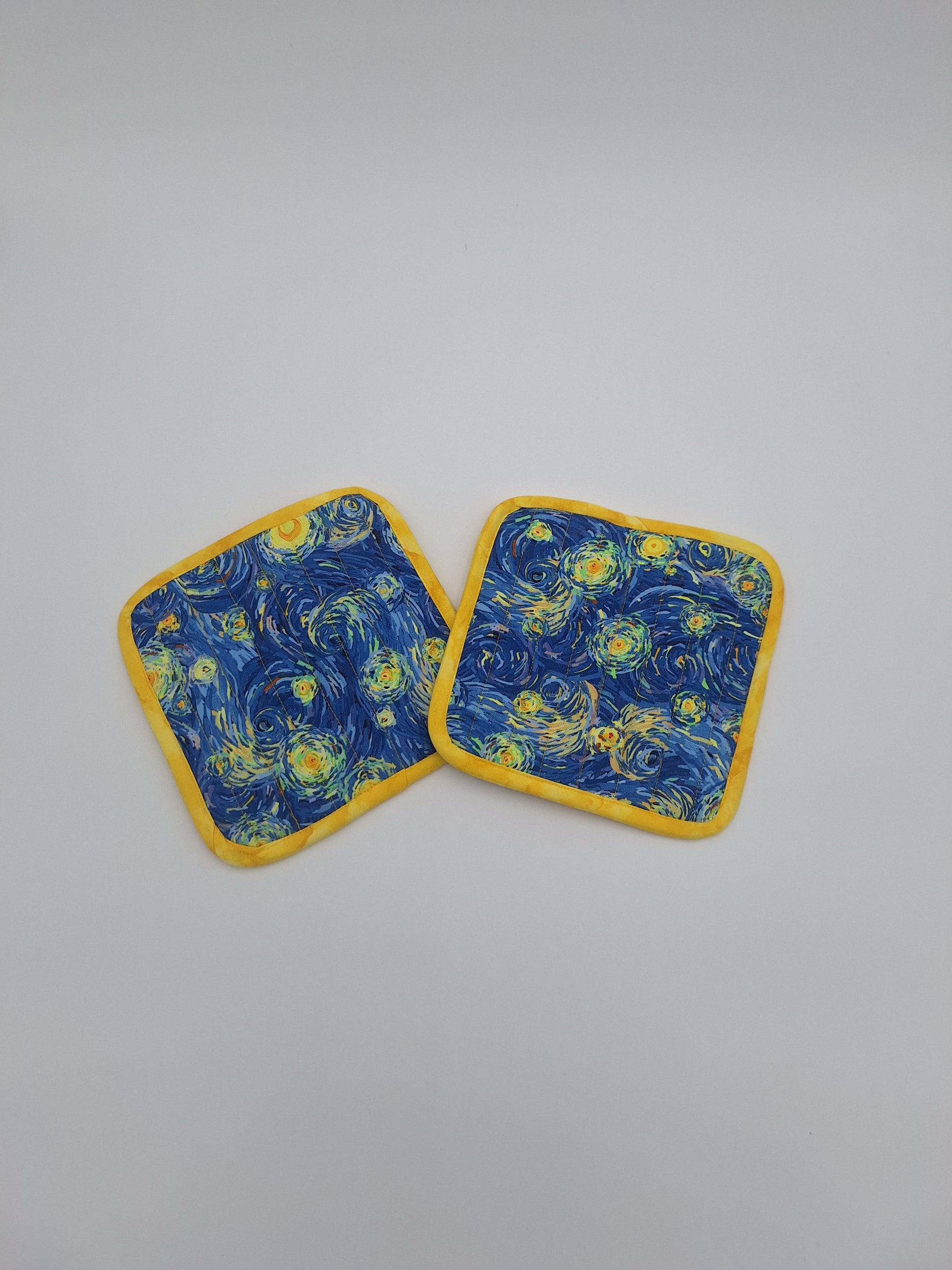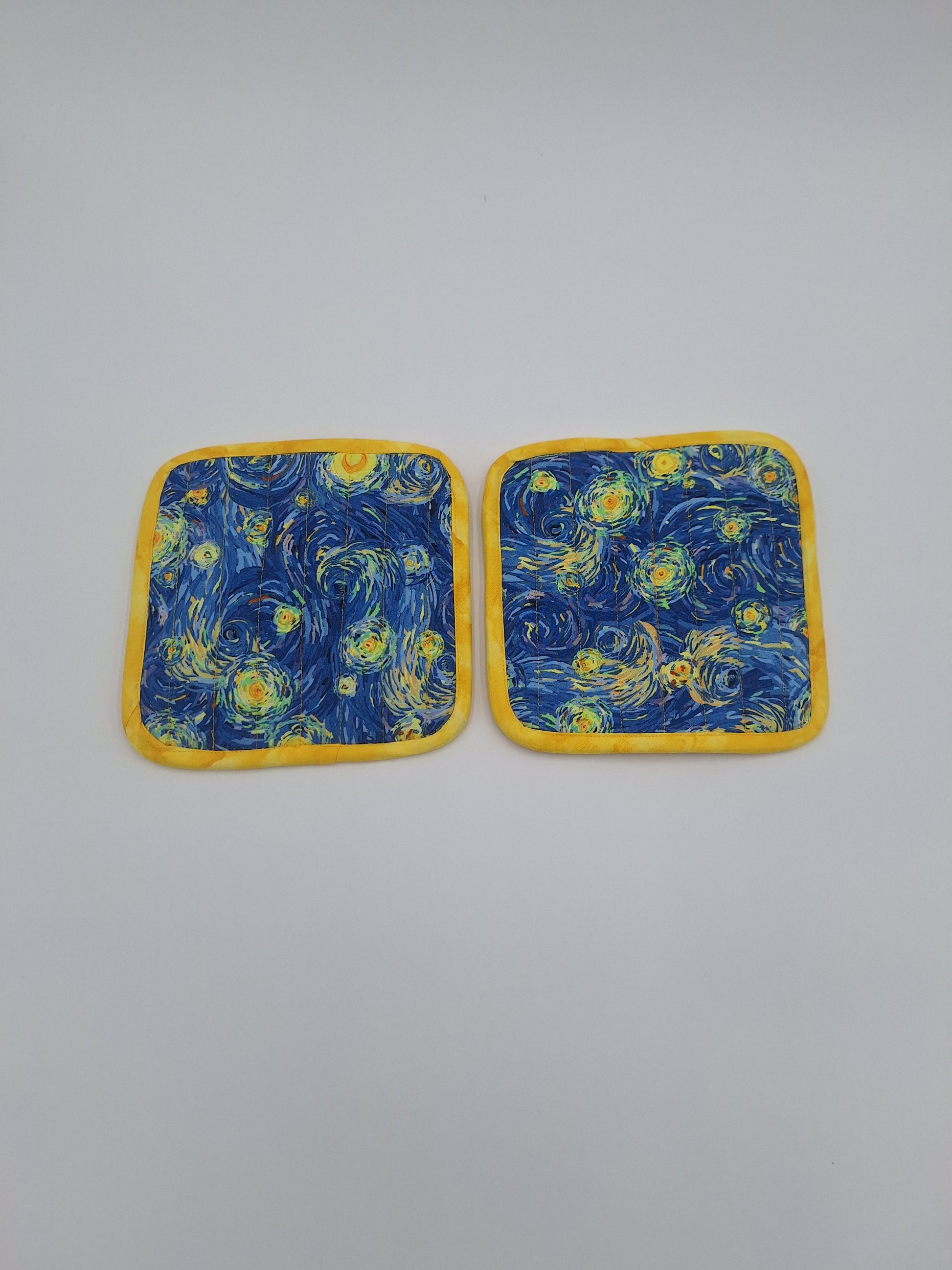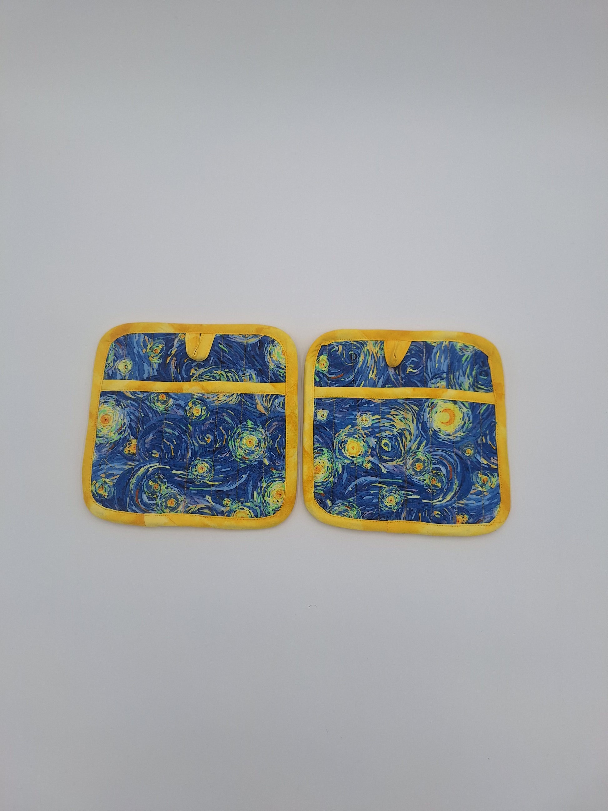 These 8" pot holders are cute and multi-functional as pot holders and trivets/hot pads.  When your hands in the pockets they are protected by both insulated and cotton batting because fingers are important, and we like to keep them intact.